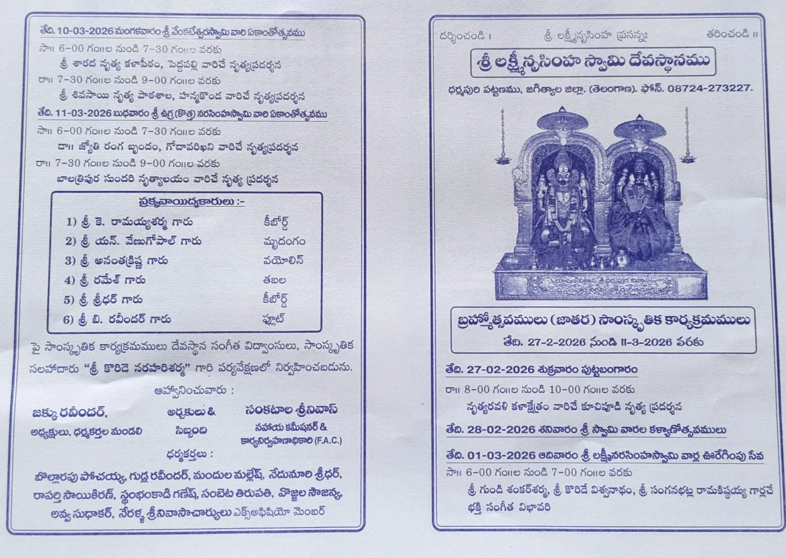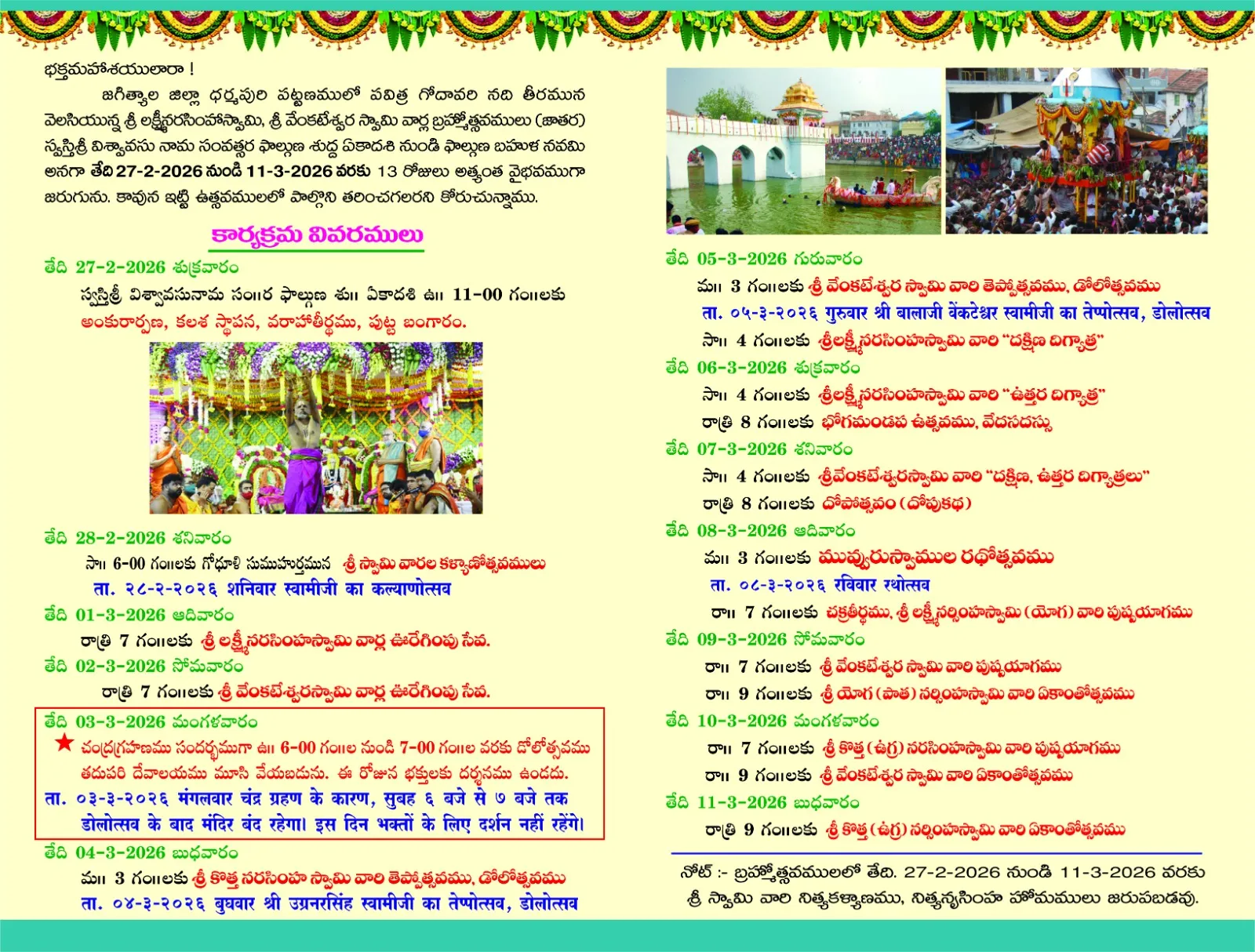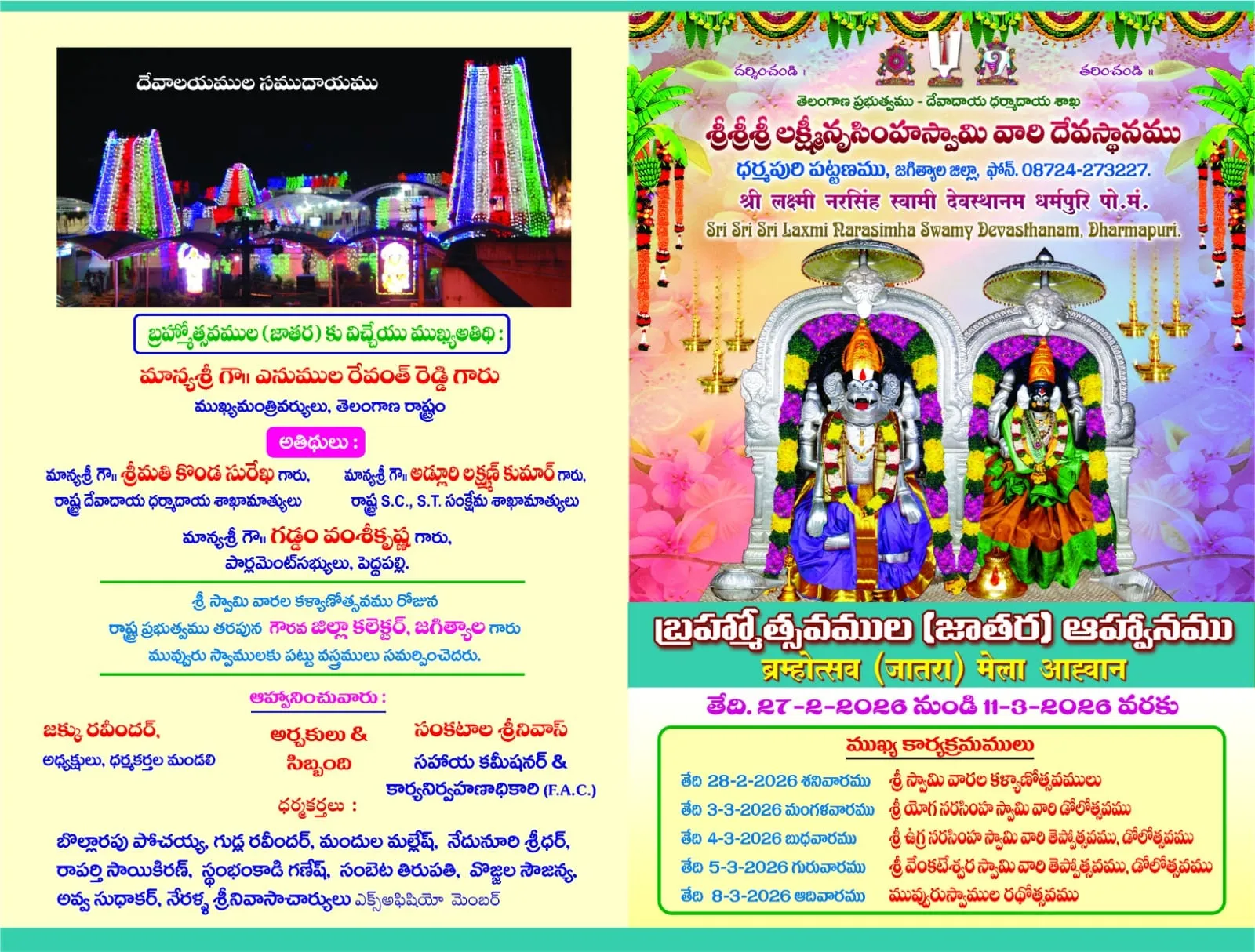 The Bramhotsavalu of Sri Lakshmi Narasimha Swamy and Sri Venkateswara Swamy, held in Dharmapuri town, Jagityala district, on the banks of the sacred Godavari river, will be celebrated with great grandeur for 27 February 2026 – 11 March 2026, 13 days. We invite you to participate in these festivals and receive the divine blessings.