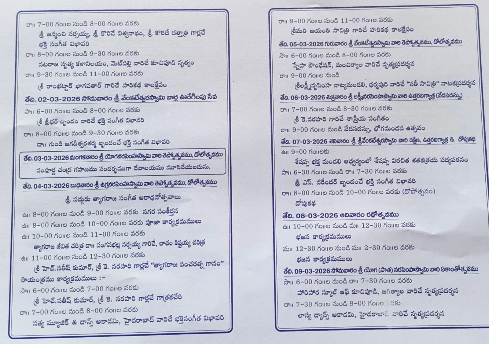 5 Mar 2026Thursday3:00 PM – Sri Venkateswara Swamy Teppotsavam, Dolotsavam. 4:00 PM – Sri Lakshmi Narasimha Swamy Dakshina Digyatra (Southern Direction Journey)